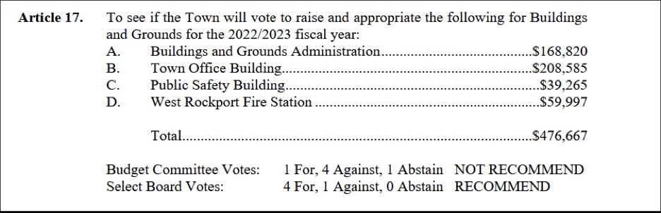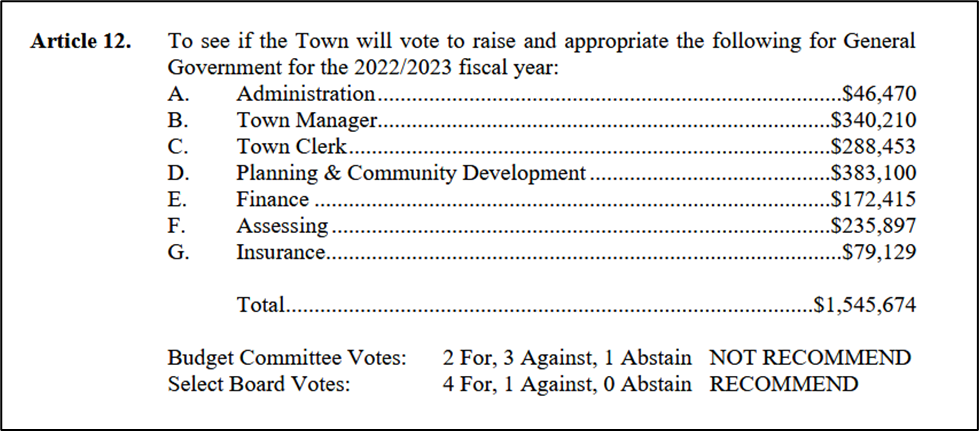 For an indication of the motive here, what follows are a few vote totals that appeared on the 2022 Town Warrant, the year before these changes were enacted. Look carefully at the Budget Committee vote.