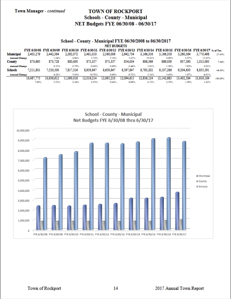 For many years, and as recently as 2017, Rockport’s annual Town Report routinely featured a table and chart showing recent budget trends.