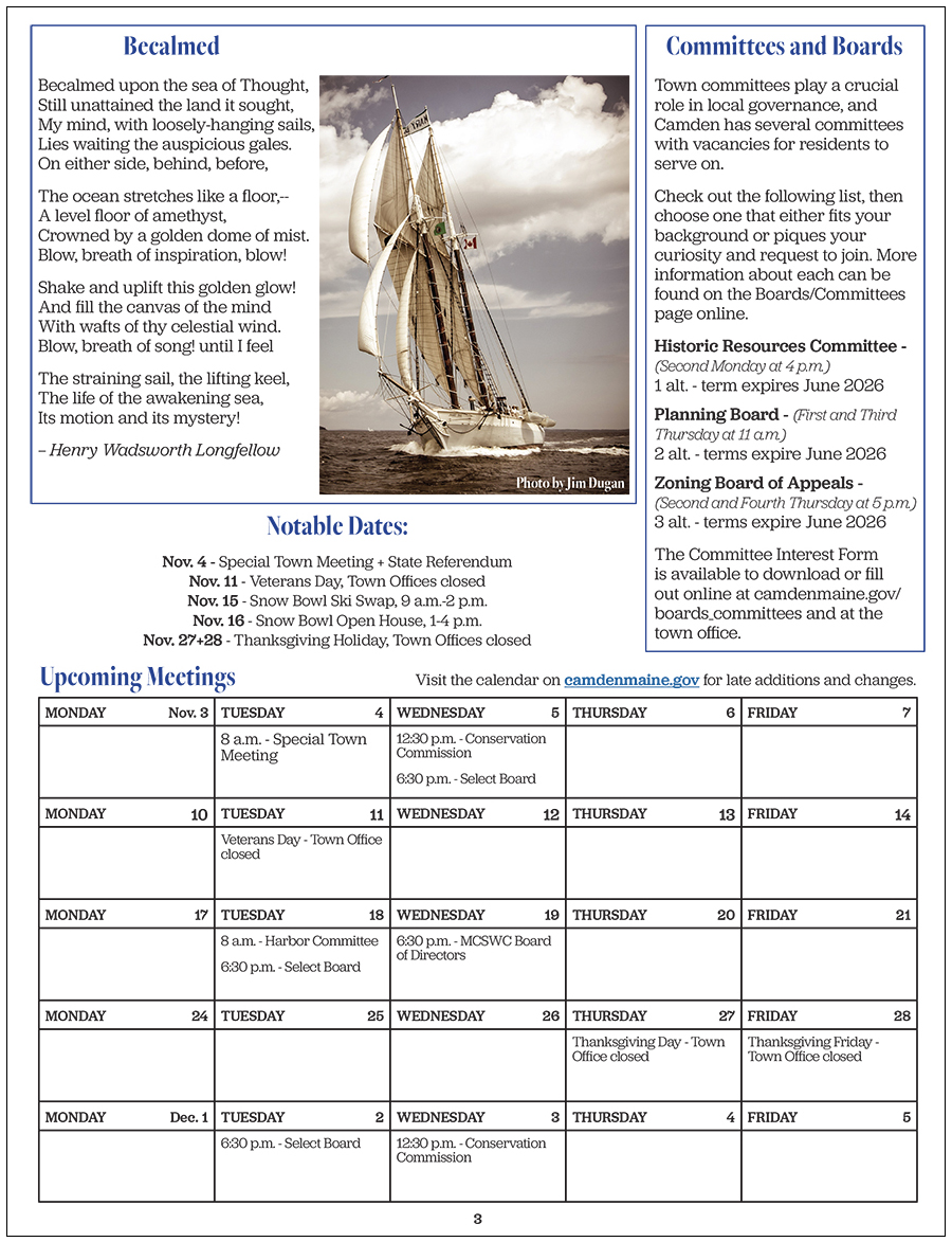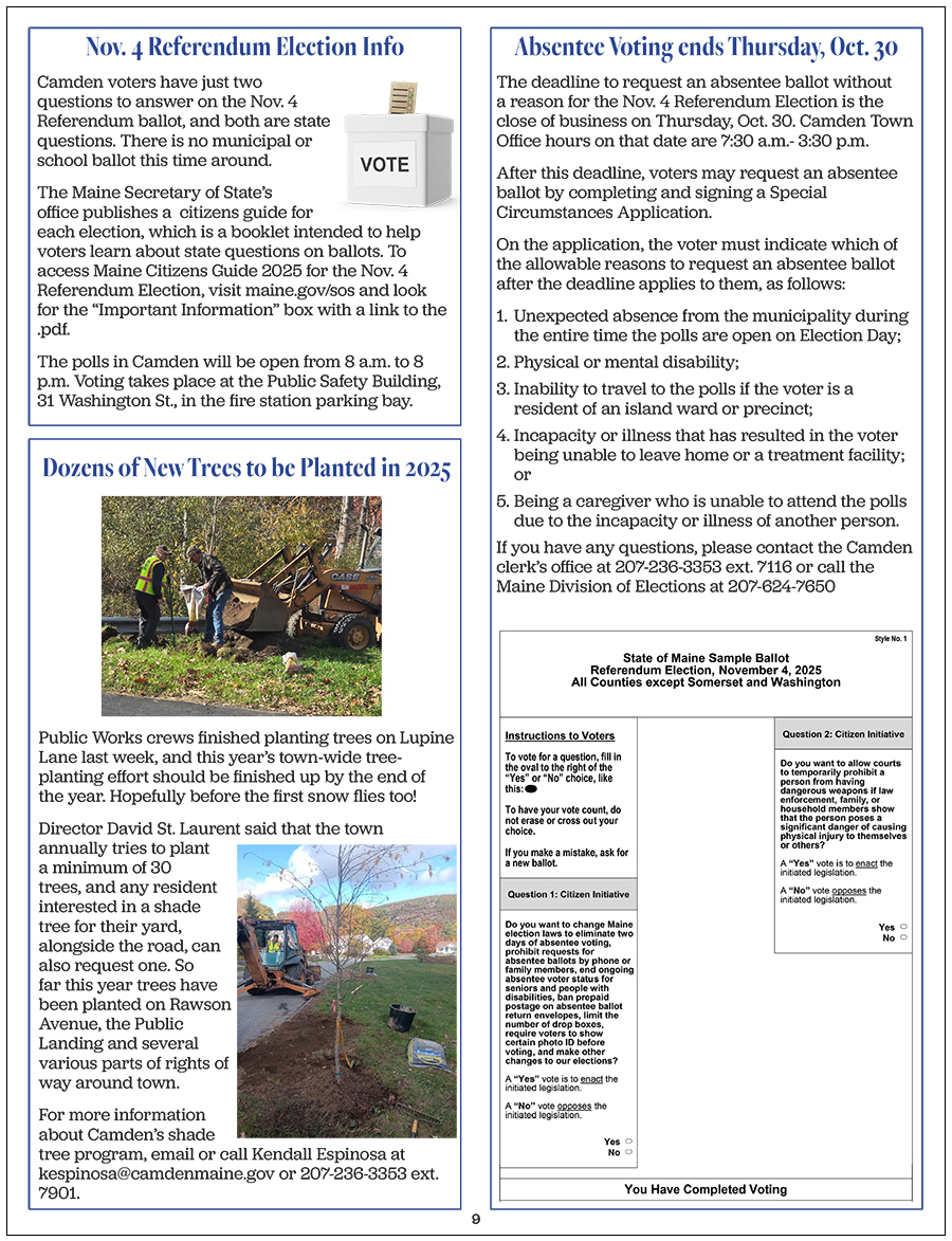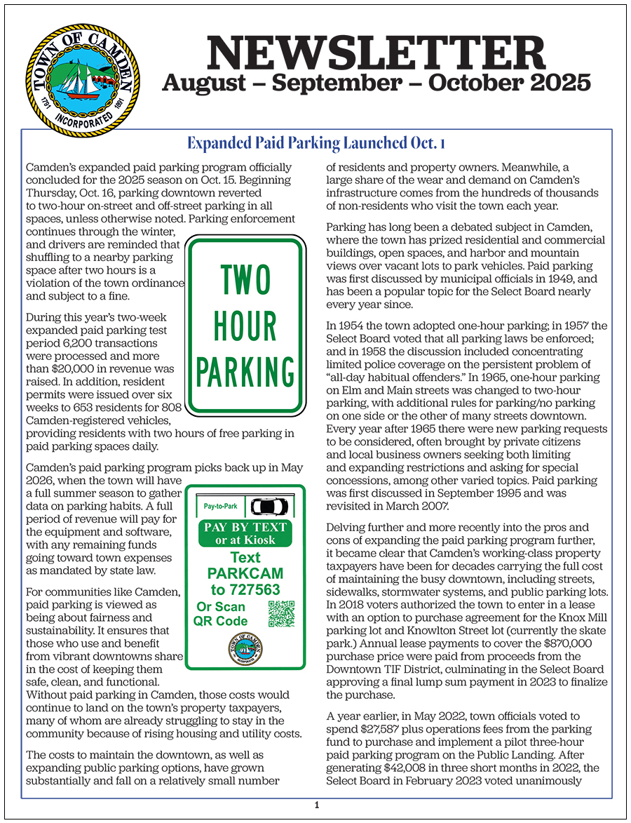 The August-September-October 2025 issue of the Town of Camden Newsletter has been published. Click HERE to read it. It is also poseted on the Town's website at www.camdenmaine.gov at News and Announcements and on the Communications page.