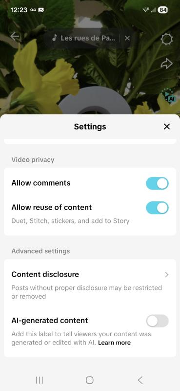 - Before publishing, go to the top of the screen. On the right hand side, there will be a little circular settings button. Scroll down until you see "Content Disclosure." Click on the arrow so that it advances to the next screen. Toggle on "Disclose commercial content" setting.
