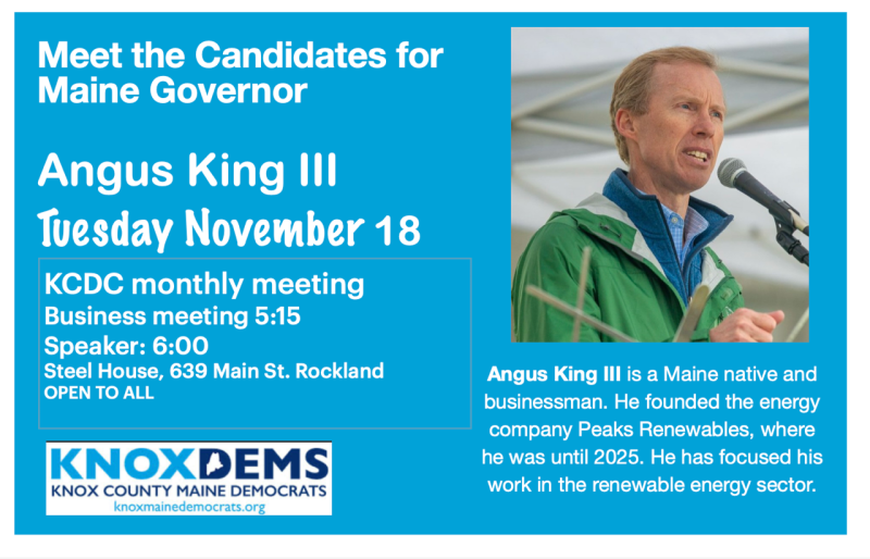 KCDC, Knox County Democratic Committee, will hold their monthly meeting and host gubernatorial candidate, Angus King III, on Tuesday, November 18 at the Rockland Steel House, 639 Main St. Rockland, ME 04841.