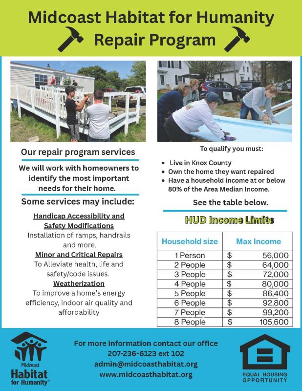 Our Weatherization and Repair Program supports qualifying low- to moderate-income homeowners by helping them preserve their homes and remain safely and affordably housed. Through essential repairs, energy-efficiency upgrades, and accessibility improvements, we promote lasting stability for the families who need it most.To see if you qualify, visit www.midcoasthabitat.org/repair or call 207-236-6123