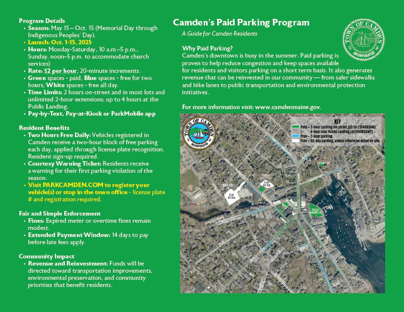 Camden residents and property owners who register a vehicle(s) in Camden are eligible for a Resident Permit, which provides two hours of free parking daily. Permit holders start their two-hour session at a kiosk or via text, and can park in any green space during that two hours. Sign up for a resident permit at ParkCamden.com and upload a photo of your vehicle registration (yellow) or visit the town office in person for assistance (bring your vehicle registration with you).