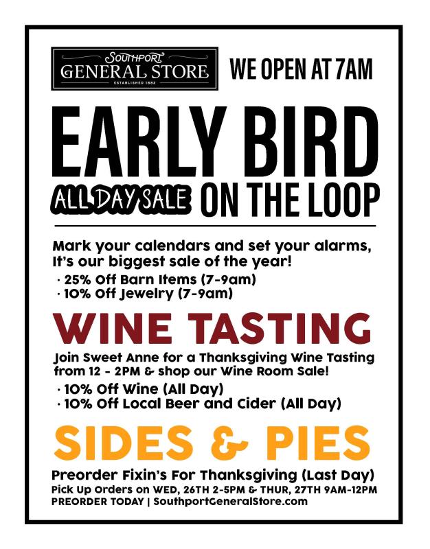 Early Bird Saturday at Southport General Store & Barn , Early Bird Saturday Sale at The Barn , Early Bird Saturday Sale at The Barn , Early Bird Saturday Sale at The Barn , Early Bird Saturday Sale at The Barn , Early Bird Saturday Sale at The Barn , Early Bird Saturday Sale at The Barn , Early Bird Saturday Sale at The Barn , Early Bird Saturday Sale at The Barn , Wine Tasting at Southport General Store