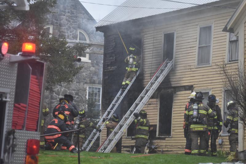 WARREN — Firefighters battled a fire that broke out in a two-story apartment building at 288 Main Street, in downtown Warren, next door to the library.