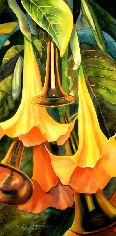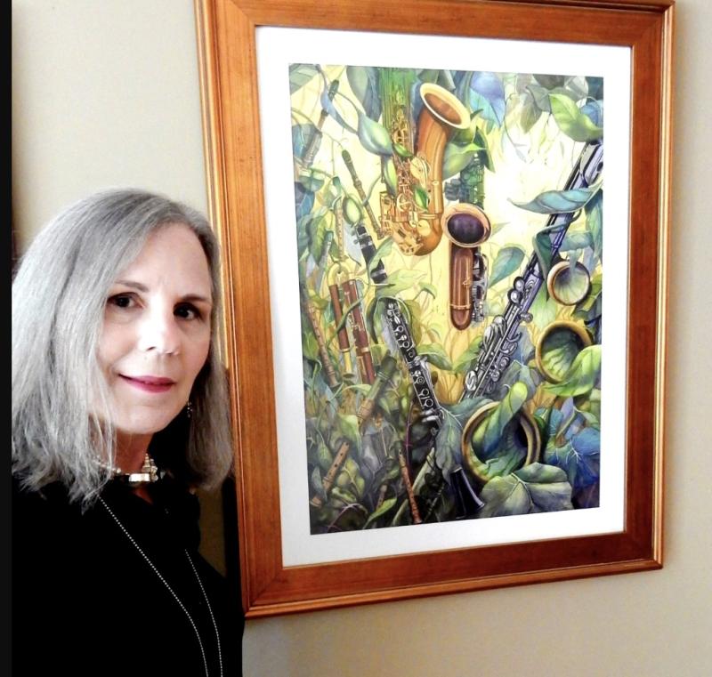 In her Music Makers series, she paired the fluted mouthpiece of a tuba with the similar funneled petals of a petunia. In a painting of tiger lilies, a lone dulcimer is seen as the emerging flower bud of the lily, with matching salmon tones. In another painting, the scroll of a violin is camouflaged with the coiled spirals of burgeoning fiddleheads.