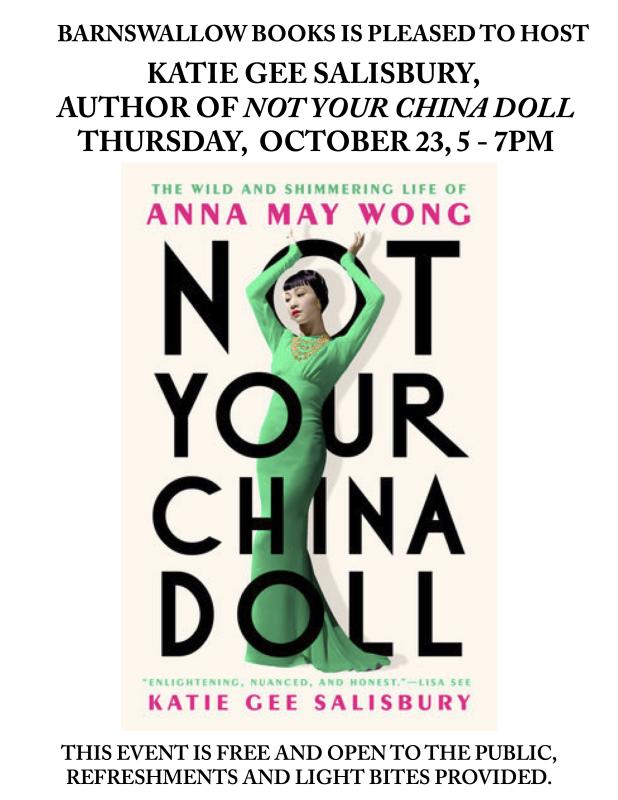 Barnswallow Books will host Katie Gee Salisbury, author of Not Your China Doll, Oct. 23, 5 to 7 p.m.
