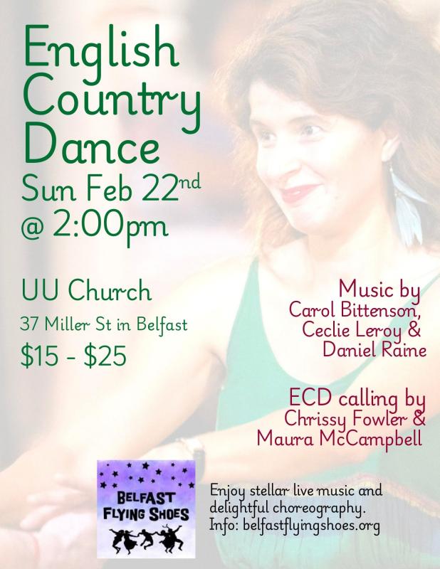 Sunday, February 22, 2026 - 02:00 pmBELFAST — On Sunday, February 22, Belfast Flying Shoes presents its monthly English country dance with callers Maura McCampbell and Chrissy Fowler.
