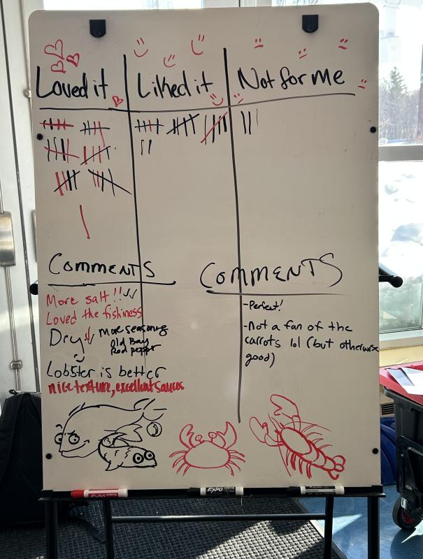 It was a discerning crowd and they did have some suggestions: "More salt", "dry", "Not a fan of carrots, but otherwise good", "lobster is better", and an "ad Old Bay Red Pepper."