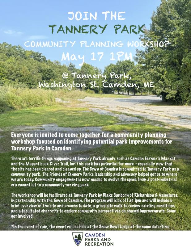 The workshop will be facilitated at Tannery Park by Blake Sanborn of Richardson and Associates, in partnership with the Town of Camden. The program will kick off at 1 p.m. on Sunday, May 17, and will include a brief overview of the site and process to date, a group site walk to review existing conditions, and a facilitated charette to explore community perspectives on phased improvements. Attend and get involved.