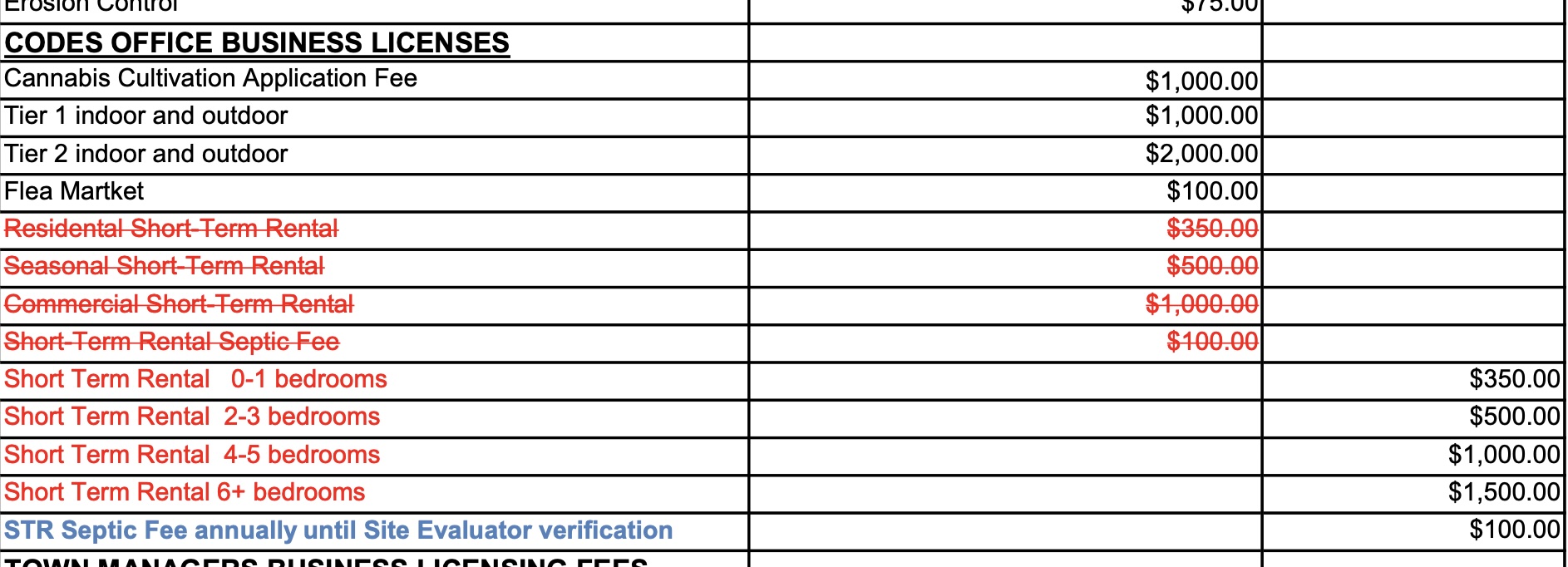 Included in the changes is a different system for charging for short term rentals. For that, the town is proposing to do away with a ladder of fees attached to whether a short term rental is residential, seasonal or commercial and to institute a new fee schedule that is based on the number of bedrooms inside a given short term rental. See the chart below: