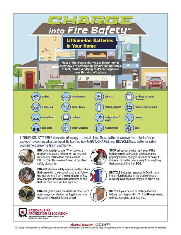 This year, the National Fire Protection Association (NFPA) chose Charge into Fire Safety: Lithium-Ion Batteries in Your Home as the theme for Fire Prevention Week. It's not an exaggeration to say that lithium-ion batteries are everywhere. Without a thought we slip phones into our pockets, wireless headphones in our ears, and the list goes on: laptops, power tools, watches, and more.