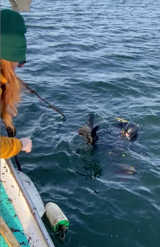 On a bright Saturday morning, BMI staff and students went out to straighten and untangle its kelp lines off City Park and used the opportunity to also try and recover the remaining 15% of the 22-foot long female Minke whale that washed ashore in Belfast in September 2024. It was then moved to a mooring in the harbor and as the carcass deteriorated, its bones scattered around the mooring site.