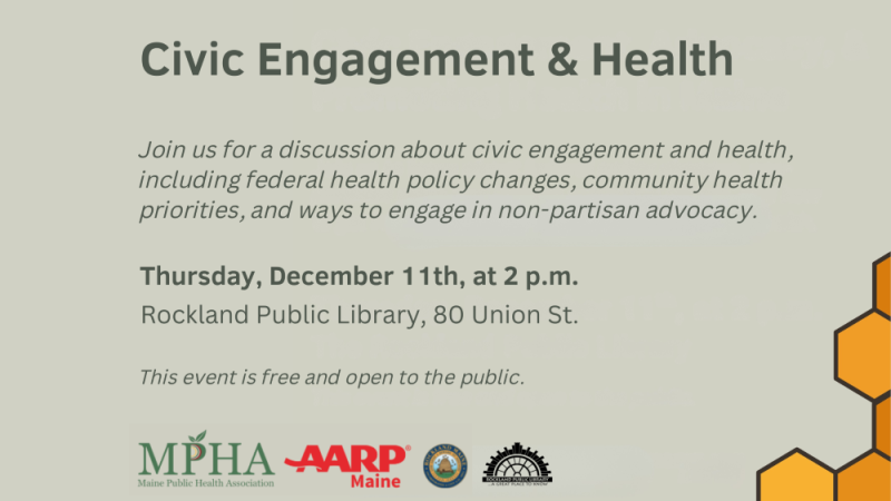 Maine Public Health Association (MPHA) hosts “Civic Engagement & Health,” Thursday, Dec. 11, at 2 p.m. This presentation and discussion, co-hosted by AARP Maine and the Rockland Public Library, will share information about non-partisan state and federal advocacy efforts and how people can get involved in their communities to promote health.