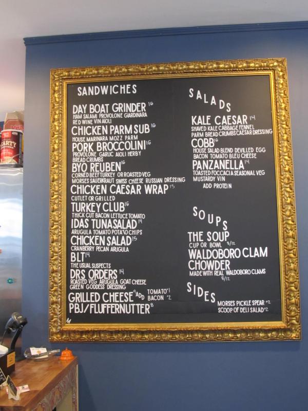 The hearty menu features classics, such as grinders, turkey clubs, Reuben sandwiches, tuna, chicken salad, BLTs, and hot chicken parmesan subs. Vegetarian items include Cobb and kale salads, as well as grilled cheese sandwiches, and a seasonal roasted vegetable sandwich. Every day, there is a homemade soup or a clam chowder.