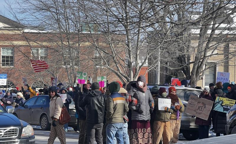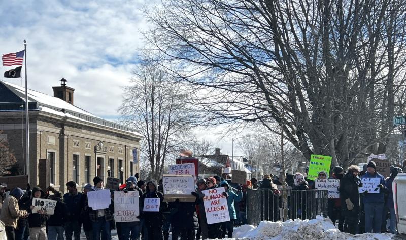 CAMDEN — At 11:30 a.m., Jan. 30, approximately 300 protesters convened on the Village Green to vent their discontent with the current political climate in the U.S. Some stood in the middle of Route 1, halting traffic for a brief period of time before Camden Police Officers directed them to the sidewalk.