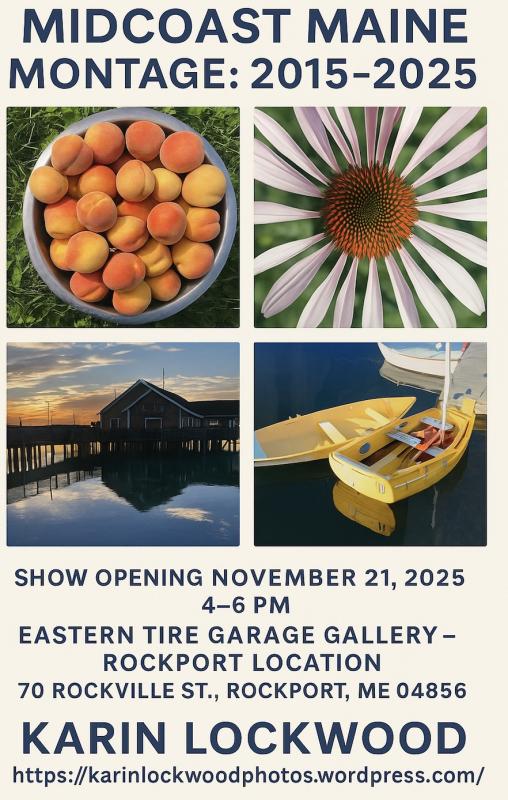 Eastern Tire Garage Gallery, in Rockport, will host the opening show of Midcoast Montage: 2015-2025, featuring the work of Karin Lockwood.