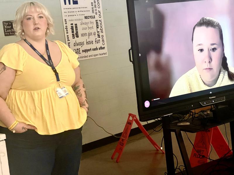 Courtney Davis, a hairdresser in Rockport, visited her alma mater Deer Isle-Stonington High School on March 9 to share with an all-school assembly her personal story of dating abuse that started when she was 20 by being swept off her feet by a much older man. Lilly DesRoberts, 21, Zoomed in from Saco to share her story of dating abuse that started in high school and included stalking through the app Life360 and her ex's threats to kill himself and her and included his arrest for domestic violence. (Photo by Patrisha McLean)