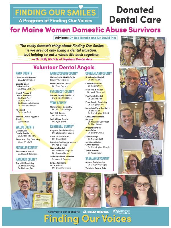 Volunteer dentists in Androscoggin, Cumberland, Franklin, Hancock, Kennebec, Knox, Penobscot, Sagadahoc, York, and Waldo.Finding Our Voices has won a Purple Ribbon Award for its Finding Our Smiles, a "groundbreaking program of donated dental care featuring 40 Maine dental providers across nine counties voluntarily restoring the smiles and lives of women survivors of domestic abuse," according to FOV, in a news release. The nonprofit won a Purple Ribbon Award in the category of "Most Innovative Service".