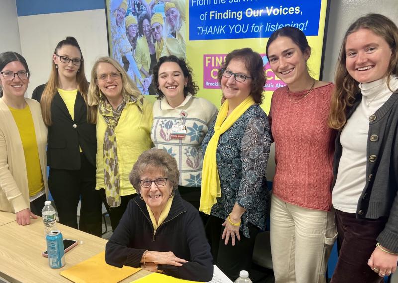 Finding Our Voices survivors shared how they were treated by medical professionals as part of a training about intimate partner abuse to 40 future doctors at Tufts Medical School in Portland. From left to right, Survivors Laudan Ghayebi, Noel Richardson, and Patrisha McLean, Student Abby Mueller, Survivor Mary Kamradt, and students Lucy Rickerich and Katherine Leggat-Barr. Seated in front is Survivor Mary Lou Smith. Photo supplied by Finding Our Voices.