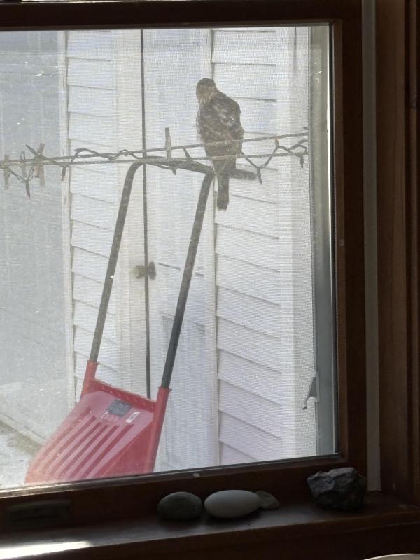 The Cooper's Hawk that has been stalking songbirds in the authors' yard. After a recent storm, it cleverly used the snow scoop handle as a temporary perch. Courtesy of Jeff Wells.