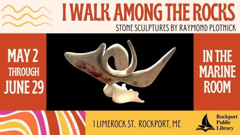 A show of stone sculptures carved by Midcoast artist Raymond Plotnick will be on exhibit in the Marine Room of the Rockport Public Library from May 2 to June 29. Entitled “I Walk Among the Rocks,” the abstract collection showcases Plotnick’s inclination toward capturing “the echo of natural shapes” in the medium of stone.