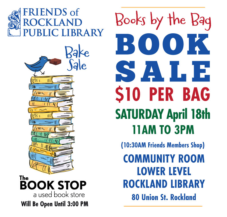 Saturday, April 18, 2026 - 11:00 am to 03:00 pmFriends of Rockland Public Library announces an inflation-free book and bake sale Saturday, April 18, from 11 a.m. to 3 p.m. (members shop at 10:30), in the Community Room downstairs at the library at 80 Union Street.