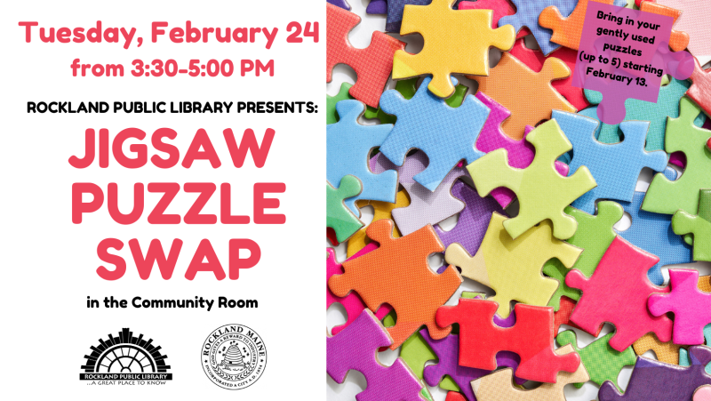 Tuesday, February 24, 2026 - 03:30 pm to 05:00 pmThe Rockland Public Library will hold a puzzle swap on Tuesday, Feb. 24, from 3:30 to 5 p.m., in the Community Room.