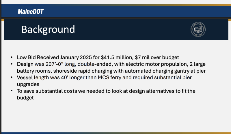 The DOT envisioned a new 207-foot ferry (40 feet longer than the Margaret Chase Smith) with a 40-foot-beam and capacity for 35 vehicles. The vessel was to be a diesel electric hybrid (full electric propulsion for ship service loads) with rapid shoreside charging.