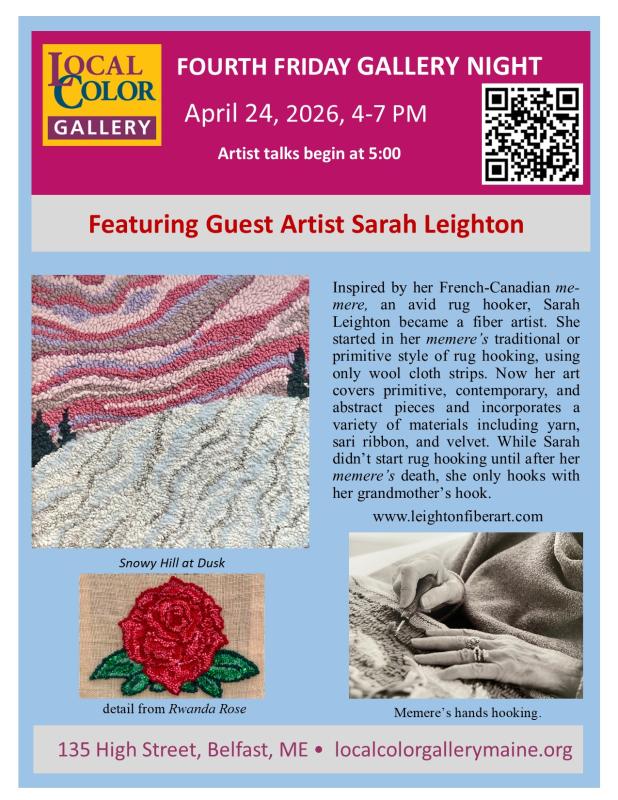 Local Color Gallery is located at 135 High Street in Belfast. April hours are Tuesday through Sunday, 11 to 4. For more information see localcolorgallerymaine.org or call 207-218-1249.