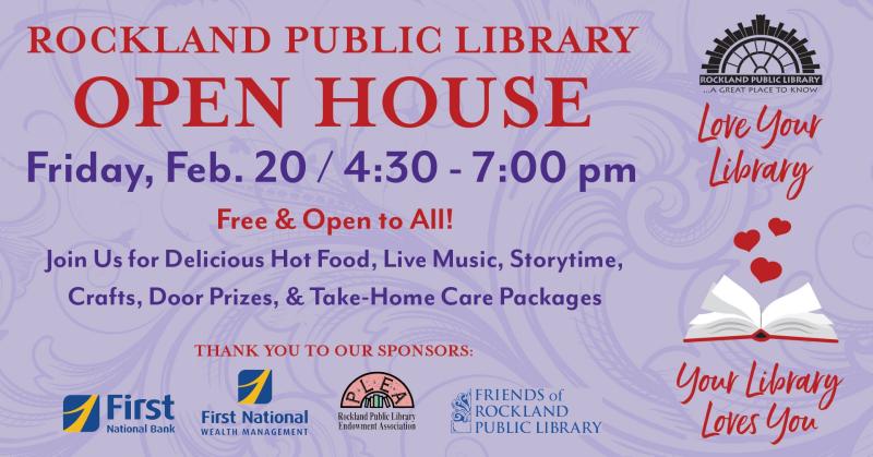 Friday, February 20, 2026 - 04:30 pm to 07:00 pmFor the first time since 2020, the Rockland Public Library and Friends of Rockland Public Library will hold the community-centered "Love Your Library; Your Library Loves You" Open House, scheduled for Friday, Feb. 20, from 4:30 -7 p.m.