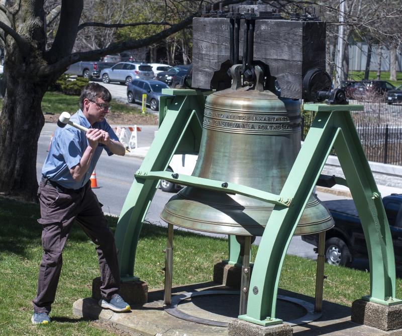 Peter Crockett, of the Maine Labor Group on Health, rings the bell on the North Lawn of the State House for each Maine worker who died as a result of their work. (Photo courtesy Maine Dept. of Labor)