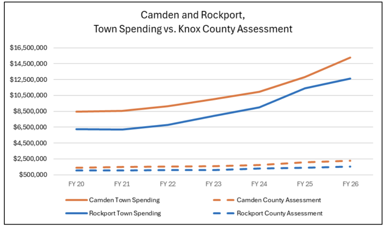 Ms. Caler, though, aims much of her fire at the counties, saying they are “proposing unusually large budget increases.” County government has its issues, to be sure, and county assessments for both Camden and Rockport have risen in recent years, but not at the rate that their own town spending has.