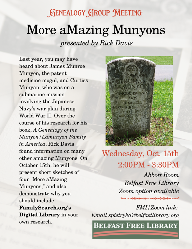 BELFAST — Join the Belfast Free Library and the Wawenoc Chapter of the Maine Genealogical Society on Wednesday, Oct. 15, at 2 p.m., in the Abbott Room of the Belfast Free Library, for a presentation by Rick Davis called “More aMazing Munyons.”