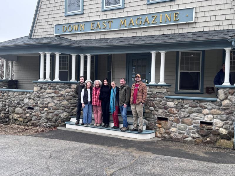 Midcoast Habitat for Humanity staff stand in front of their new home at the iconic Downeast Building, located at 680 Commercial Street in Rockport. From left: Dash Marley, Finance Manager; Maggi Blue, Development Manager; Tia Anderson, Executive Director; Jenny Hixon, ReStore Manager; Todd Look, ReStore Assistant Manager; and Patrick Kelly, Repair Program Manager. Not pictured: Peter Fagonde, Construction Manager. (Photo courtesy Midcoast Habitat for Humanity)