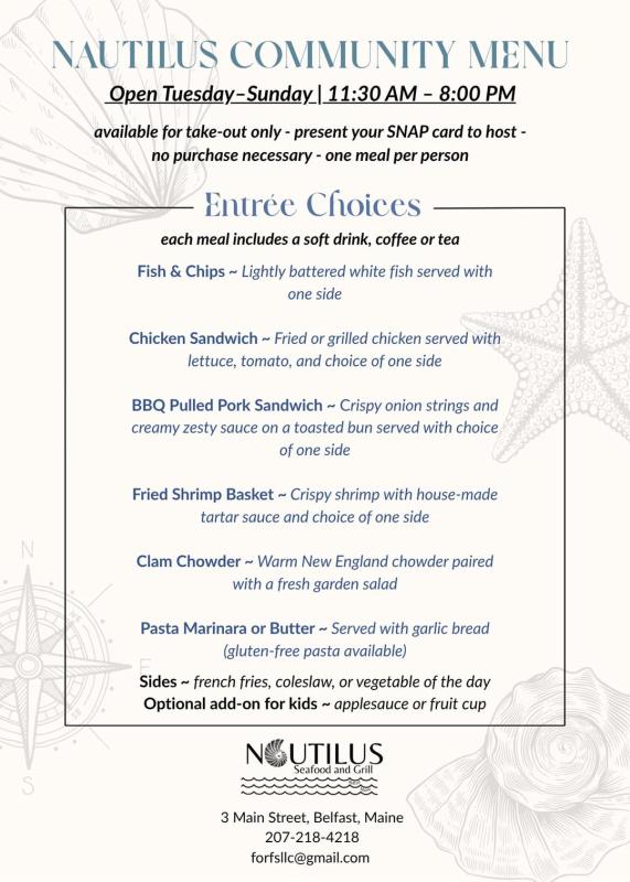 BELFAST—Last week, on November 1, when the distribution of SNAP benefits for millions of people stopped, neighbors stepped up their support with many donating to food banks. In Belfast, Nautilus Seafood & Grill's owners, Shawna Aitken, Shelly Trisch, and Mary Marchini, came up with a novel idea to help in their own way. They created a Community Menu available for takeout only, free of charge to every SNAP recipient who presented their card to the host.