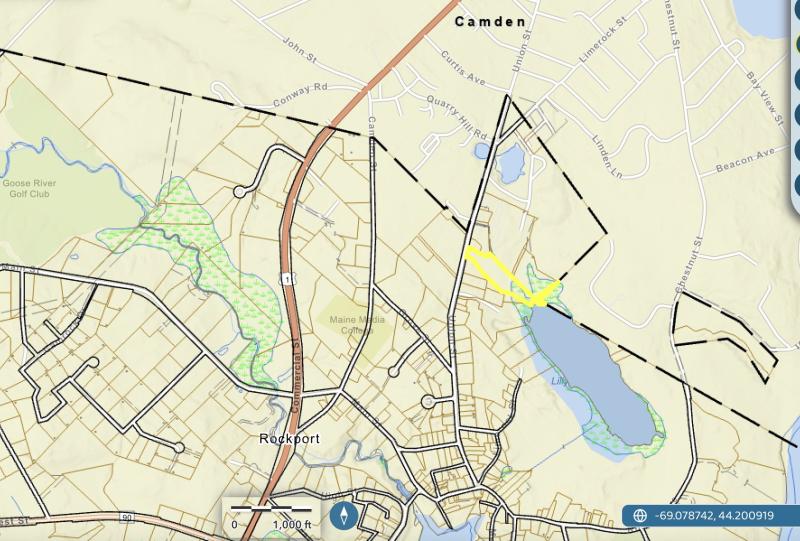 The parcels along Union Street in Rockport. The parcel outlined in yellow belongs to Lily Pond Partners LLC, the entity that plans to remove the Rock Road. Abutters and neighbors are objecting. (Image courtesy Town of Rockport)