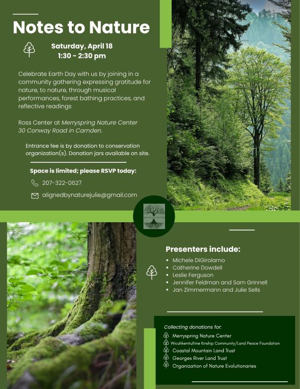Space is limited, and advance registration is encouraged. Admission is by donation, with proceeds supporting environmental stewardship organizations, including Merryspring Nature Center, Coastal Mountains Land Trust, Georges River Land Trust, Land Peace Fopundation, and the Organization of Nature Revolutionaries.