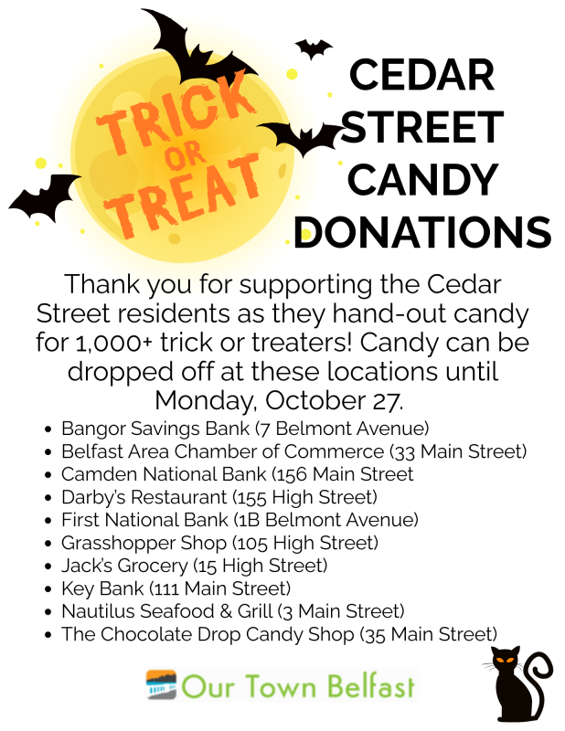 Our Town Belfast is holding its 2025 Cedar Street Halloween Candy Drive. Each year, several thousands of people descend to Cedar Street for trick or treating. To help residents out, OTB is organizing a candy drive with 10 drop-off locations around Belfast (listed below).