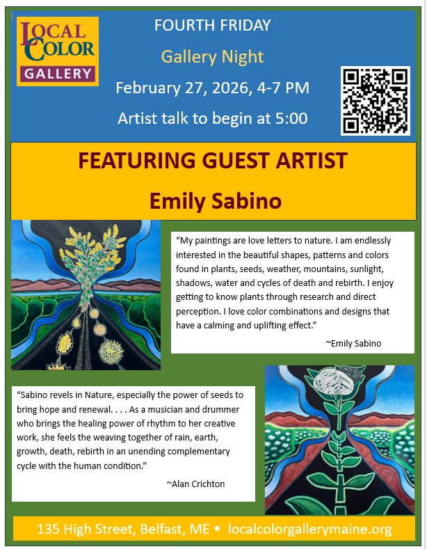Local Color Gallery is located at 135 High Street in Belfast. Winter hours are Wednesday through Saturday, 11 to 4. For more information see localcolorgallerymaine.org or call 207-218- 1249.