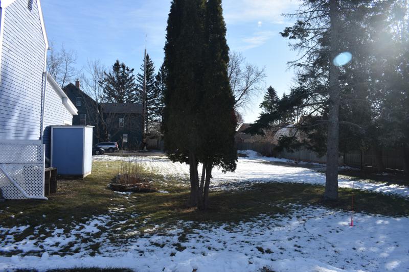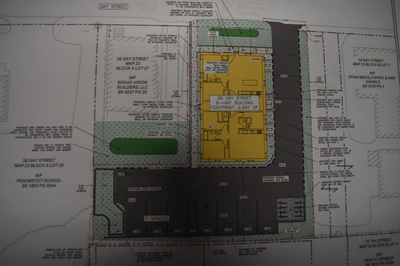 Parking is to be behind the buildings. Current design shows six regular parking spaces and one ADA spot. The driveway to access the lot will be along the remaining space abutting the next property over (home of WRFR). The abutter on the other Gay Street side is the Penobscot Bay Language School.