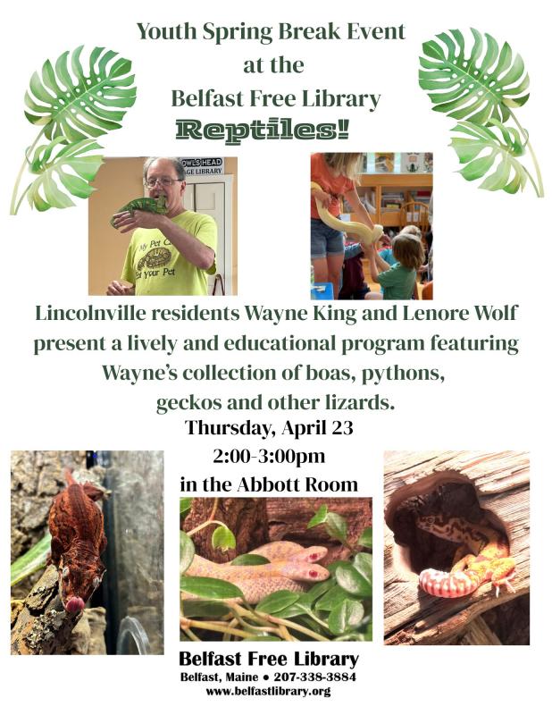 Join Wayne King and Lenore Wolf as they present a program with a collection of boas, pythons, geckos and other lizards to liven up your spring break. They will present an educational program on Thursday, April 23, from 2 - 3 p.m., at the Belfast Free Library, 106 High Street, Belfast; no registration required.