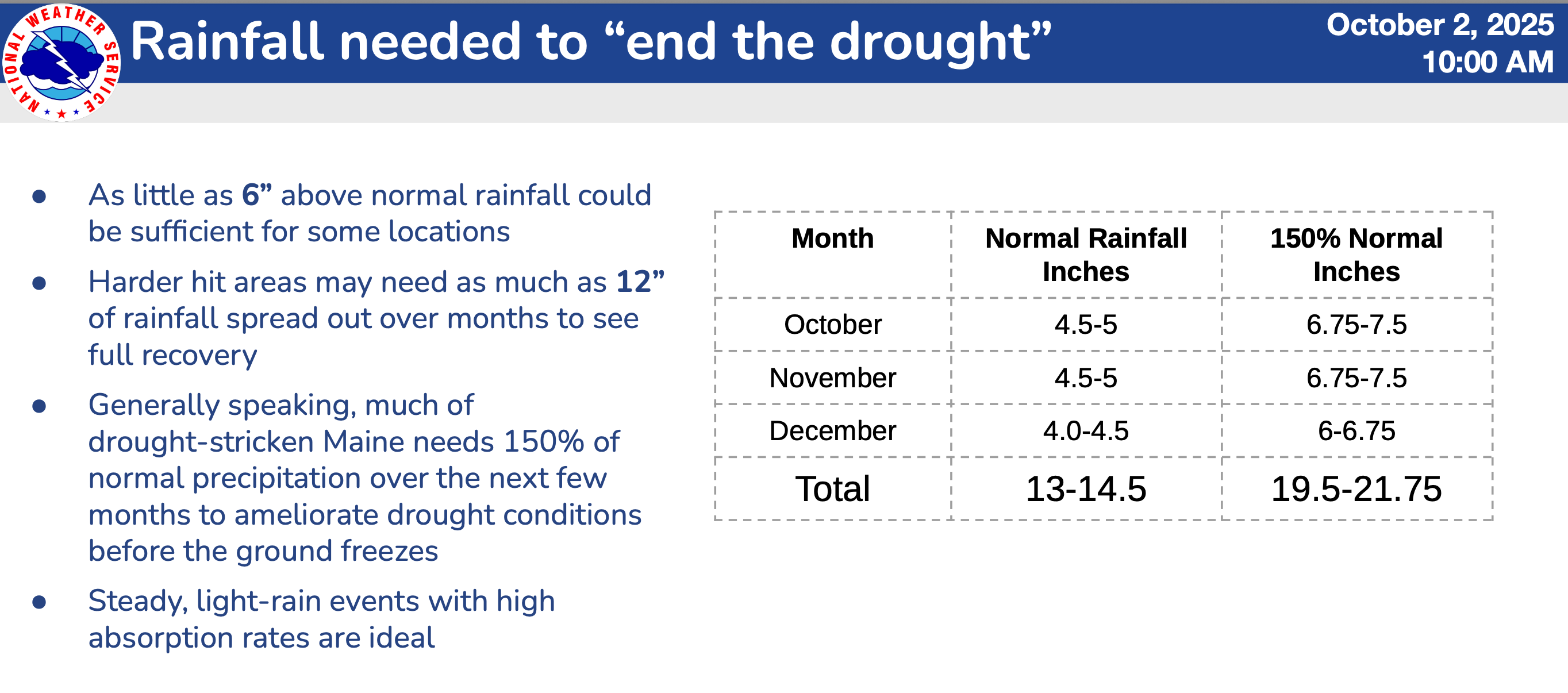 To the National Weather Service, as little as six inches above normal rainfall could be sufficient for some locations to end the drought, but the hardest hit areas: "may need as much as 12 inches of rainfall spread out over months to see full recovery. Generally speaking, much of drought-stricken Maine needs 150% of normal precipitation over the next few months to ameliorate drought conditions before the ground freezes."