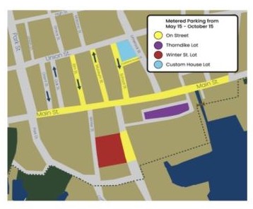 Metered parking will be found at Elm Street, Museum Street, School Street, Custom House Place, and Main Street from Park Street to Summer Street.