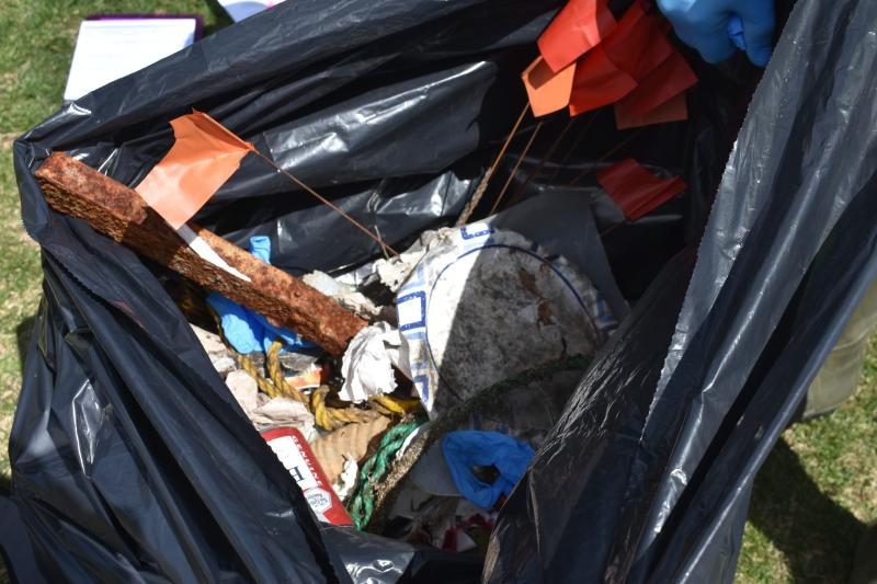 Because of them, the landscape is a little less mired. Now headed to the Transfer Station are a bike lock, a long broken piece of wide plastic pipe, rusted poles, plastic crates, Styrofoam, rope, picnic trash, tissue, “only one hypodermic needle this year,” according to a returning volunteer (properly tended to based on specific protocols) and, of course, cigarettes. The waste came from Chapman Park, Harbor and Buoy parks, Sandy Beach Park, Snow Marine Park, the Harbor Trail along the Downtown area, the ferry terminal. Each site had a location leader, courtesy of the Energy and Sustainability Advisory Committee, which did the larger amount of coordinating for the event. At each station, volunteers recorded their finds before separating trash into designated containers.