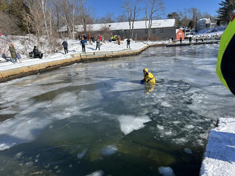 Some dashed in and out, while others tentatively tiptoed into the cold Atlantic, with water temperatures hovering around 34 degrees F. One resilient Mainer, Collin Cunning, of Belfast, leaned back into the water like it was a Lazy Boy recliner and chatted for almost 10 minutes with Camden Firefighter Derek Jay, who was in an ice water rescue suit, and likewise was easily bobbing around between the small icebergs.