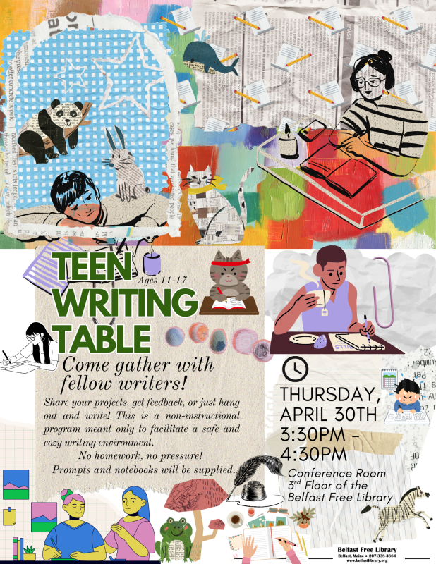 Teens aged 11-17 are invited to an hour of no pressure writing together with others on Thursday, April 30, from 3:30 - 4:30 p.m., at Belfast Free Library.