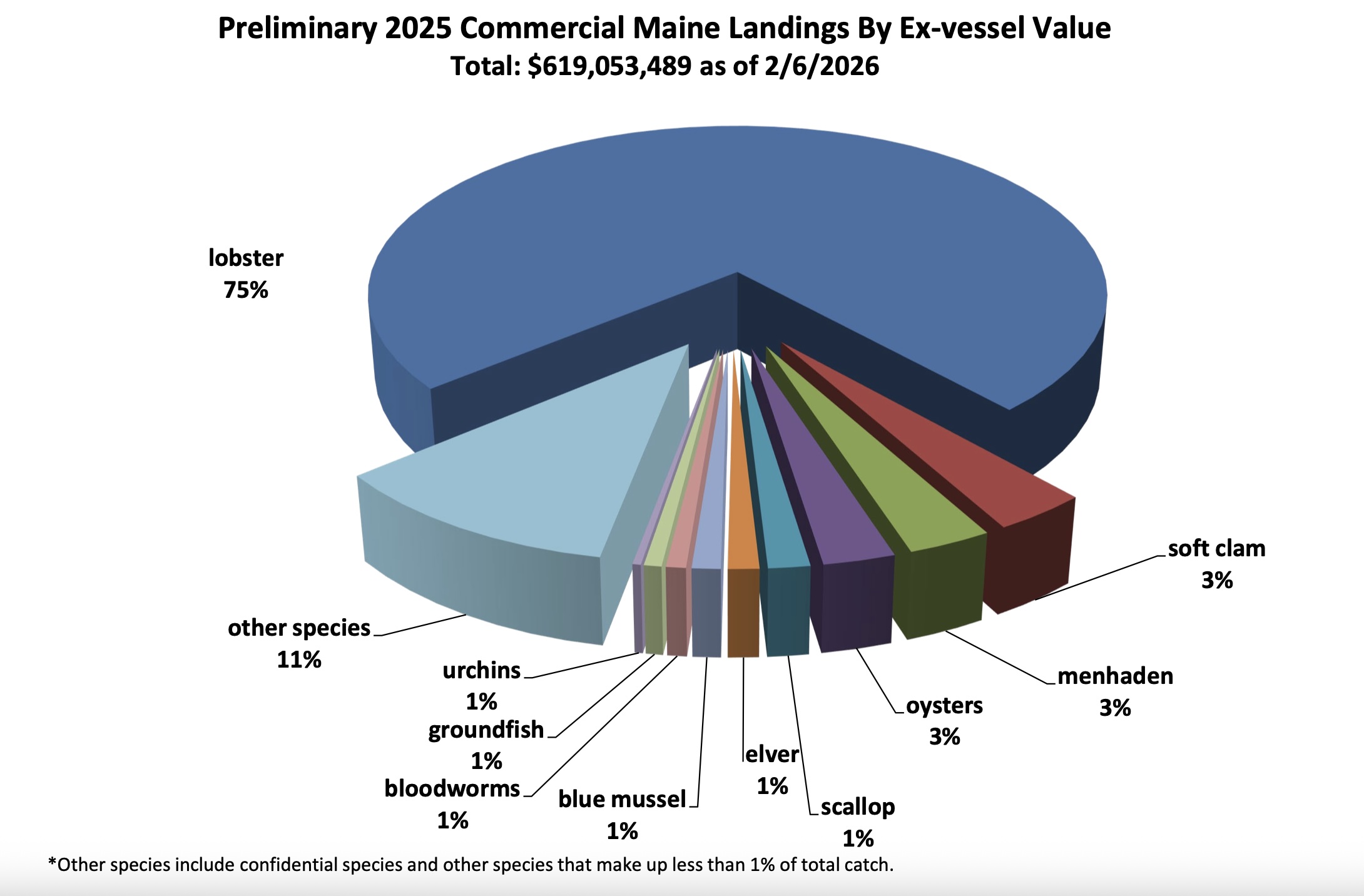 According to preliminary data released by the Maine Department of Marine Resources, Maine’s commercial harvesters earned $619,053,489 in 2025, which was the 14th consecutive year commercial fishery earnings surpassed $500 million.