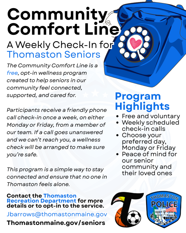 Community Comfort Line is voluntary and free to senior residents of Thomaston. According to the press release, the program reflects a shared commitment between public safety and recreation to strengthen connection, promote wellbeing, and ensure no resident feels overlooked.