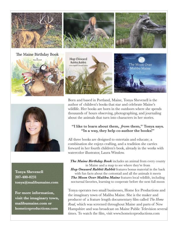 Shevenell, the creator of The Maine Birthday Book, will share her experiences exploring the state, including a 190-mile trek across Maine for her documentary film, and talk about the real-life animals that inspire her stories.